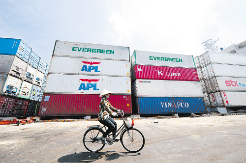 3月5日,在越南胡志明市的西贡港,一名工人骑车经过集装箱。2007年越南经济猛增8.5%,但目前越南正面临如何避免经济过热这一棘手问题。新华社/法新