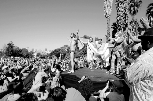 3月23日,在美国旧金山的多洛雷斯公园举办的耶稣装扮大赛上,观众争相为台上表演的选手拍照。一年一度的耶稣装扮大赛是当地复活节的传统活动。 新华社/路透