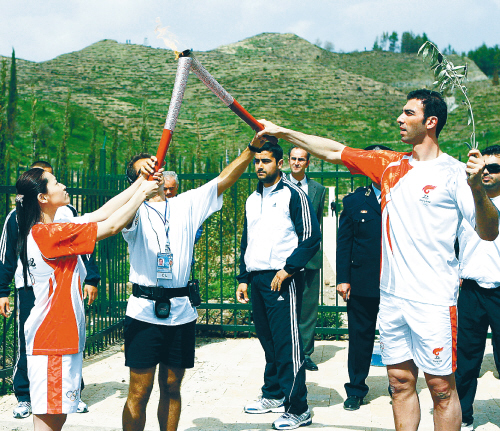 | ← 3月24日,北京奥运会圣火传递第一名火炬手、希腊跆拳道运动员亚历山大·尼克拉泽斯(右)在火炬传递中,与中国火炬手罗雪娟进行交接。新华社记者 毕明明 摄 |