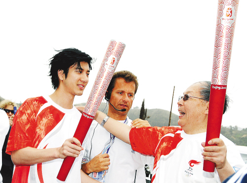 | 3月24日,中国火炬手王力宏(左)与刘鸿亮(右)在交接后简短交谈。 新华社记者 吴晓凌 摄 |