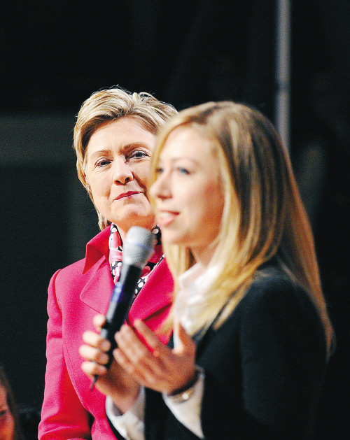 | 3月26日,切尔西(右)在华盛顿参加竞选活动,帮助母亲希拉里争取年轻选民。 新华社记者张岩摄 |