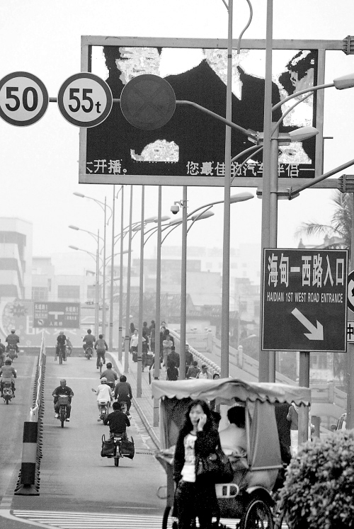 近日,海口人民桥桥头路段竖起一块巨大的视频广告架,正好与交通标示牌重叠,视频每天不停地播放广告,司机根本就看不清楚交通标示牌。 本报记者 古月 摄
