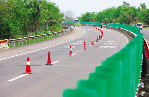 3月23日,东线高速公路黄竹至琼海路段,工人们正在加紧安装道路中间的挡光板,以确保博鳌亚洲论坛年会期间道路安全畅通。东线高速左幅海口至琼海段自去年12月20日起大修,对总长100公里的路段分期分批改造。 本报记者 王凯 摄
