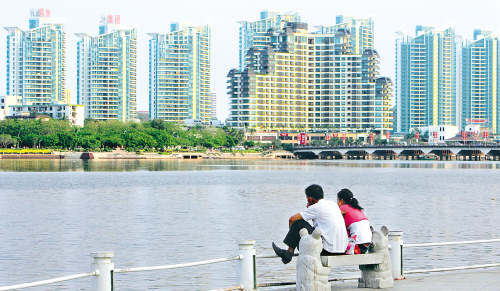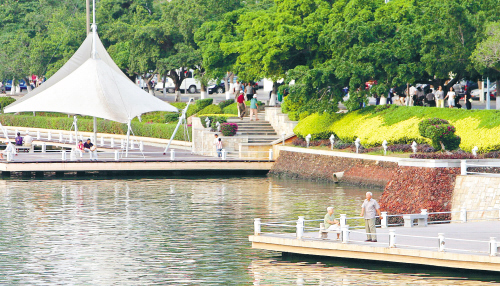 ↓市民在三亚河畔休闲,对面是高楼林立的时代海岸项目。 本栏图片由本报记者 李英挺 摄