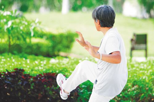 →下洋田广场,一位市民在树荫下晨练。