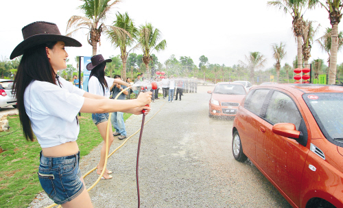 3月27日,三亚市郊的呀诺达热带雨林景点门口,车模用喷射水花的特殊方式迎接来自上海的“绿色生态之旅”新车试驾车队。 本报记者 李英挺 摄