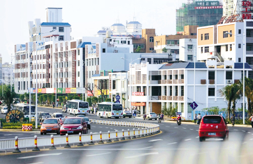 海口 3月28日,在海口海府大道,汽车行驶在崭新的城市景色中。街道旁的建筑立面改造,让市容市貌焕然一新。本报记者 张杰 摄 (相关报道见第二版)