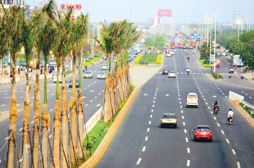 | 3月28日,汽车行驶在海口国兴大道。随着街道旁建筑立面改造以及道路绿化的完成,海口的市容市貌焕然一新。
