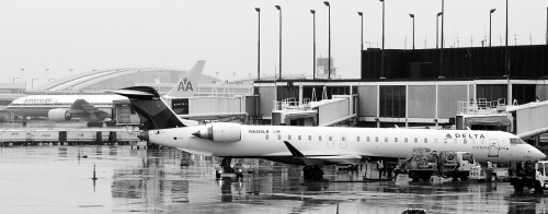 3月27日,一架美国达美航空公司飞机(右)与一架美利坚航空公司飞机(左)停放在美国芝加哥奥黑尔国际机场。美国美利坚航空公司和达美航空公司当日宣布停飞大批航班,以配合联邦航空局要求的检修行动。 新华社/路透