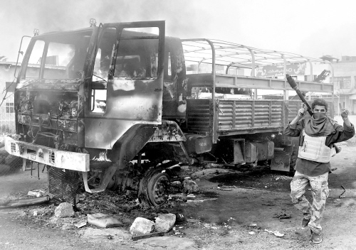 3月27日,在伊拉克首都巴格达,一名什叶派民兵武装“迈赫迪军”成员携武器从军车残骸旁走过。当天,伊拉克总理马利基表示,伊安全部队将与巴士拉的“迈赫迪军”“战斗到底”。 新华社/路透