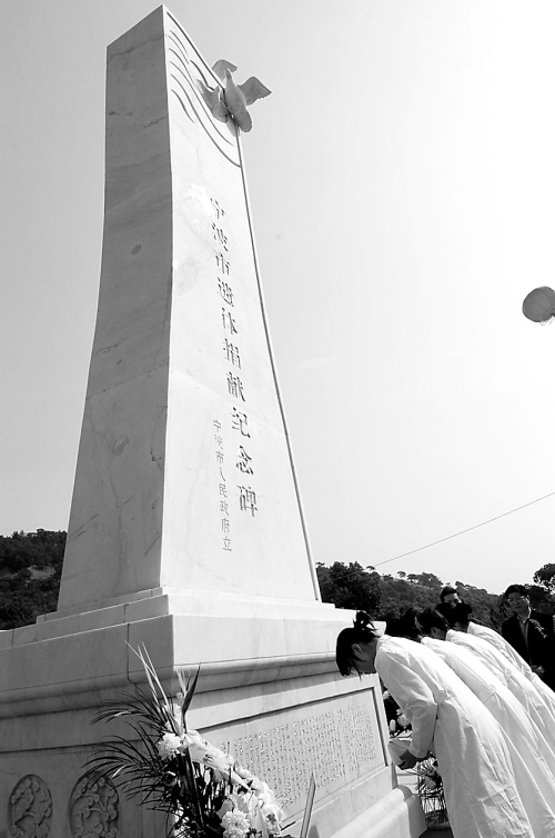 3月28日,医学院学生在宁波市遗体捐献纪念碑前鞠躬致敬。当日,浙江省宁波市遗体捐献纪念陵园正式落成开放。陵园内的纪念墙上镌刻着20位遗体捐献者和角膜捐献者的姓名。这是浙江省首个遗体捐献纪念陵园。 新华社发(张培坚 摄)