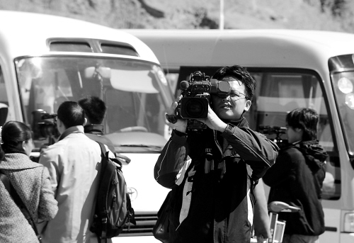 | 3月26日,一名记者在抵达机场后进行采访拍摄。当日,由国务院新闻办组织的境内外记者采访团从北京经成都飞抵西藏自治区首府拉萨采访“3·14”打砸抢烧事件经过。