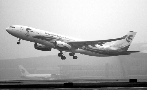 3月29日上午10时,“奥运圣火号”飞机从北京首都国际机场起飞,前往雅典迎接奥运会圣火。 新华社发