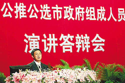 话题缘起: 南京市日前举行公推公选市政府组成人员演讲答辩会(见右图),16名经过首次民主推荐确定的候选人在电视上公开PK,竞争南京市劳动和社会保障局局长、市食品药品监督管理局局长、市旅游局局长、市级机关事务管理局局长等4个职位。南京电视台、新浪网、龙虎网等媒体现场进行了电视、网络直播。