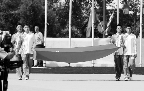 | 图为在圣火交接仪式上,中国青年手执国旗入场。 新华社发 |