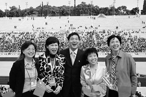 | 图为邓亚萍(右二)、叶乔波(左二)等在圣火交接仪式现场合影。小新发 |