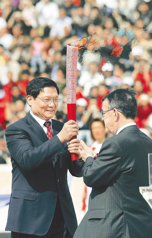 ← 3月30日,中共中央政治局委员、北京市委书记、北京奥组委主席刘淇(左)在雅典1896年首届现代奥运会主会场从希腊奥委会主席基里亚库手中接过北京奥运会圣火火炬。当日,北京奥运会圣火交接仪式在雅典1896年首届现代奥运会会场举行。北京奥运圣火将于31日抵达北京。 新华社记者 戚恒 摄 (相关报道见第十四版)