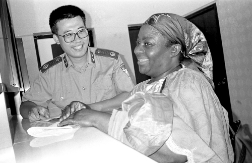 | ↑1995年6月,海南省公安厅工作人员在给境外旅客办理落地签证。