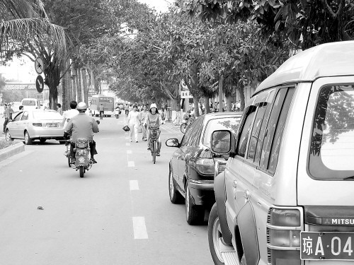 但是,沿途不少单位,如海南大学北门、联通海口分公司、建设银行海甸支行附近,非机动车道上停满了办事的车辆,摩托车只能从自行车道上驶过。一位刚停好汽车的陈先生告诉记者,他看见这些黄线,还以为是泊车位,所以就停在了这里。在海甸六路附近,公交车站也在非机动车道上,要想借道十分困难。