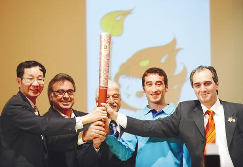| 4月1日,北京奥运会火炬传递活动伊斯坦布尔站中方火炬手、中华人民共和国驻土耳其大使孙国祥(左一)与部分土耳其火炬手合影。伊斯坦布尔是北京奥运会火炬境外传递的第二站。传递活动将于4月3日在此展开。 新华社记者 郭磊 摄 |