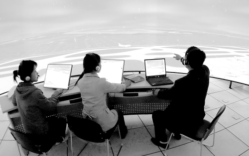 空管科研基地的科技人员在模拟阴雨天气下的飞机起降训练。 近日,中国民航大学空管科研基地成功研发出“视景360度全真模拟机场塔台飞行指挥三维运行仿真训练系统”。该系统的成功研发,不但解决了在特殊气象状况、飞行故障条件下的模拟训练难题,还为我国民航实现“低成本、高效率、大规模”培养和训练空中管制人员的目标提供了技术保障。 新华社发