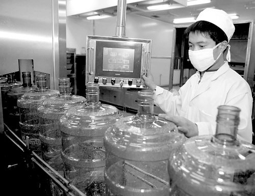 4月1日,北京燕京啤酒集团公司矿泉水厂工人在装水线上检查桶装水水桶的质量。 当日,国家质检总局有关人士透露,北京市已有100多家桶装水生产厂家采用产品质量电子监管码系统,从源头上保证桶装水的真实身份,以确保消费者的饮水安全。 新华社记者 陈建力 摄