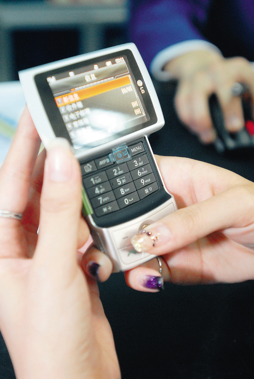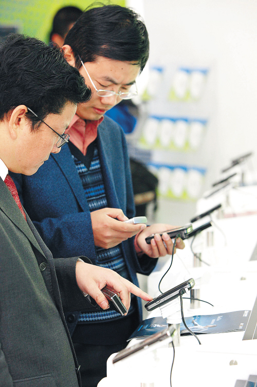 | 4月1日,两位上海市民正在中国移动的3G展示厅内试用3G手机。