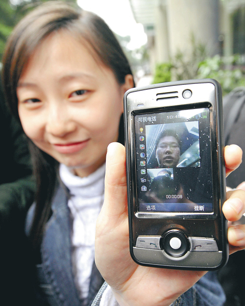 | ↑4月1日,广州市民丁梅在展示刚开户的3G手机,她正在与另一位3G手机用户进行可视通话。
