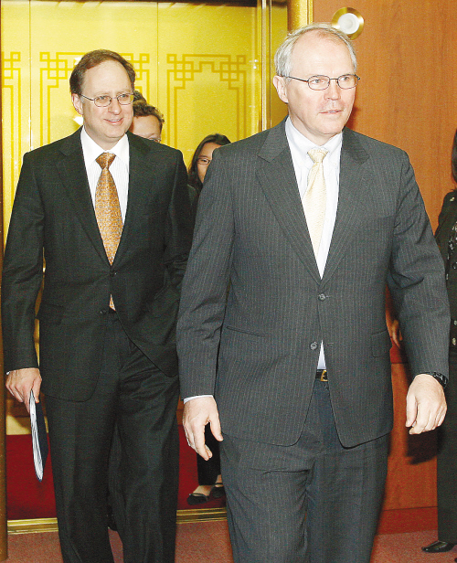 4月1日,六方会谈美国代表团团长、美国助理国务卿希尔(前)抵达韩国首都首尔。当天,希尔与朝核问题六方会谈韩国代表团团长千英宇举行了会谈。韩国和美国官员在首尔表示,韩美希望朝鲜尽快进行彻底的核申报,否则韩美将考虑采取“进一步措施”。 新华社/法新