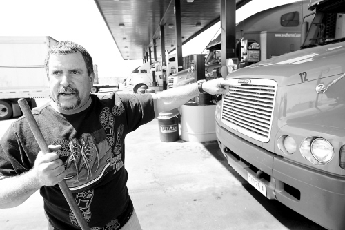 4月1日,在美国加利福尼亚州奥克希尔,一名个体卡车司机边清扫卡车边抱怨油价太高。 当日,美国各地的个体卡车司机举行罢工,抗议油价上涨并要求政府稳定油价。 目前在奥克希尔,柴油的售价已经达到每加仑4.179美元。 新华社/法新