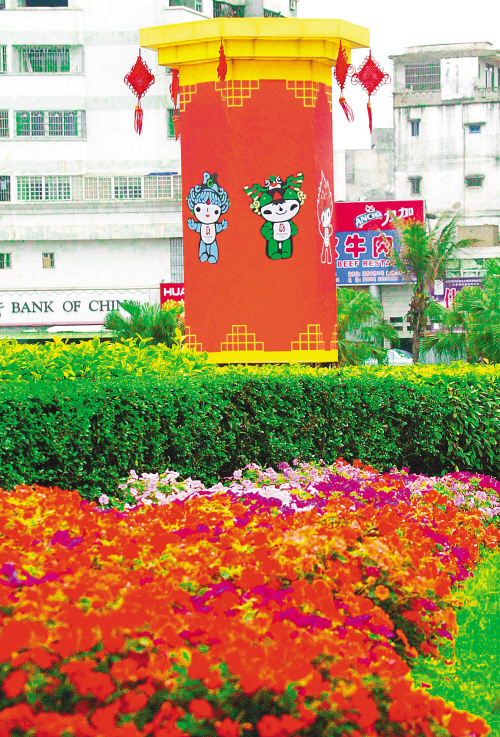↑海口市三角池转盘中间竖起巨大灯笼,为即将到来的博鳌亚洲论坛年会和海南建省办经济特区20周年庆典增添喜庆气氛。 本报记者 古月 摄