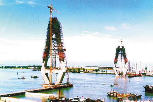 | 大图:2000年9月28日,海口世纪大桥南主塔顺利封顶。 本报记者 苏建强 摄