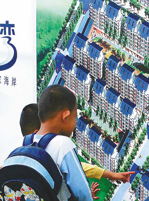 | ←三亚市海棠湾安置区效果图前,即将搬迁的小村民在看“新房”。