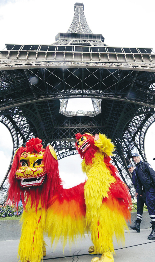 | 4月7日,演员在埃菲尔铁塔下进行舞狮表演。当日,北京奥运会圣火传递活动在法国巴黎举行。新华社发