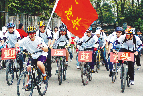 | 4月7日是都江堰“清明放水节”的最后一天,200余名来自四川各高校的大学生自行车爱好者,以效仿古人快马“赶水头”风俗的方式,迎接即将到来的北京奥运会。“赶水头”是古代放水后,由官员快马赶在水头的前面向下游报告,堰工们举着竹竿在水头前向下游奔跑,沿途百姓则争相舀水,祈祷五谷丰登。新华社发 |