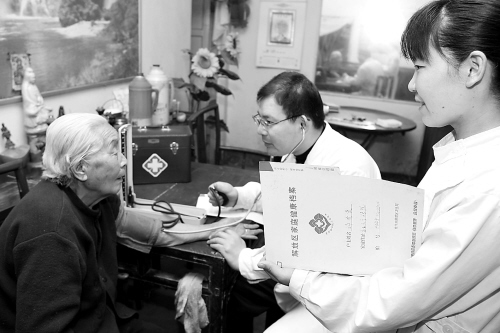 4月7日,在焦作市解放区民权街社区,卫生志愿者为许秀英老人进行健康检查。 4月7日是世界卫生日。连日来,河南省焦作市解放区的700余名社区卫生志愿者深入到居民家中,免费为辖区内困难家庭的慢性病患者、孤寡老人和残疾人进行健康检查。 新华社发(唐玉磊 摄)