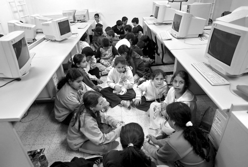 4月8日,在耶路撒冷以北的吉瓦特泽夫定居点的一所学校里,参加防空演习的学生躲在桌子下面。以色列当日在全国范围内进行了防空演习。 新华社/法新