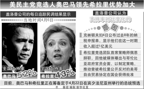 美民主党竞选人奥巴马全国支持率领先希拉里