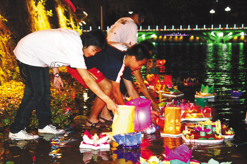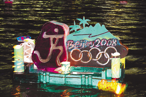 记者在现场看到,这些灯上写着“祝福2008北京奥运”、“爱我中华”等字样,有些还画上了奥运会的五环图案(左图)。原来,这里正在进行迎奥运“放飞梦想”放河灯活动。