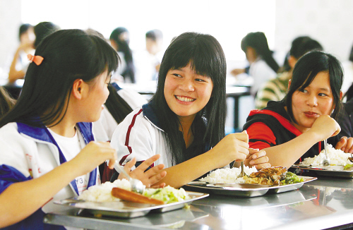 在昌江黎族自治县民族中学,来自贫困山区的黎族学生在学校食堂里开心就餐。前年八月开始,二百多名王下乡中学的初中生集体转学到县民族中学。县委县政府拿出二百多万元,向孩子们提供三包———包吃、包住、包入学。 本报记者 张杰 摄