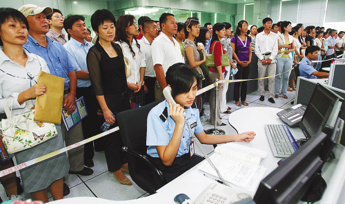 | 在海口市公安局,警务翻译志愿者参观110报警服务大厅。 本报记者 李英挺 摄 |