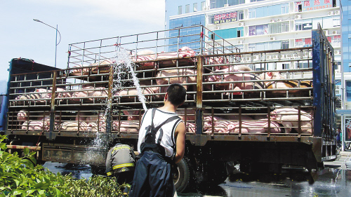 | 消防人员给运猪车洒水降温。