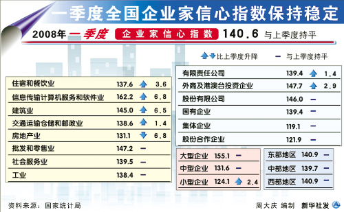 据新华社北京4月8日电 (记者张毅、周英峰)国家统计局8日发布的全国企业景气调查结果显示,今年一季度企业家信心指数继续置于景气高位并与上季度持平。