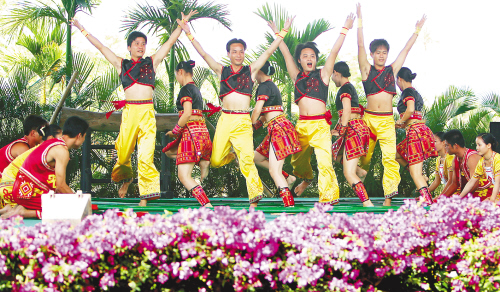 | 4月8日,三亚河东区举行庆祝“三月三”竹竿舞比赛。