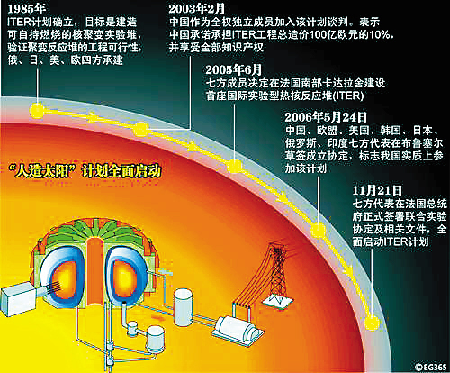 在地球上构建一个人造太阳,这是参与国际热核聚变实验堆(ITER)项目的欧盟、中国、美国、日本、韩国、俄罗斯和印度的共同梦想。2006年11月21日,7方在法国爱丽舍宫签署的国际热核聚变实验堆联合实施协定,为该项目提供了法律和资金保障,标志着这一人类未来30年内最大规模的科研项目进入正式实施阶段。