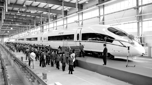 这是时速350公里“和谐号”动车组下线仪式现场(4月11日摄)。 4月11日,中国国产时速350公里CRH3“和谐号”动车组在中国北车集团唐山轨道客车有限责任公司下线,标志着中国铁路技术装备现代化取得又一重大成果。中国也由此成为世界上仅有几个制造时速350公里高速铁路移动装备的国家之一。 新华社记者 杨世尧 摄