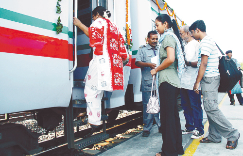 4月14日早上,在孟加拉国首都达卡,旅客们登上40多年来的首列从达卡开往加尔各答的客车。孟印两国铁路客运中断43年之后正式实现铁路客运服务。 新华社发