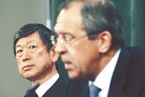 ↑4月14日,俄罗斯外长拉夫罗夫(右)与日本外相高村正彦在莫斯科会谈后出席记者招待会。拉夫罗夫说,俄罗斯呼吁同美国、欧洲、日本以及其他相关国家组建联合导弹防御系统。新华社/法新