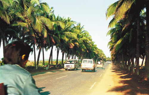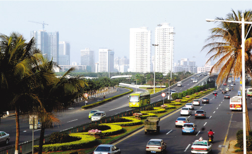 ←1990年1月,“滨海大道”仅仅是由海口城区通往秀英港码头的一条两车道公路。 ↓现在的滨海大道已经是纵贯海口西海岸、长达20多公里、双向六车道的城市交通主干道(2008年3月12日摄)。