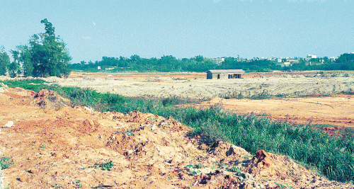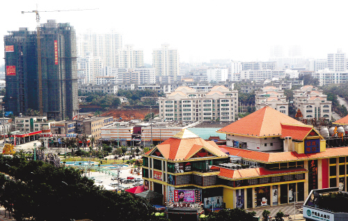 ↑1990年1月拍摄的海口金融贸易区刚刚平整的土地。 →如今的海口金融贸易区高楼林立(2008年3月14日摄)。